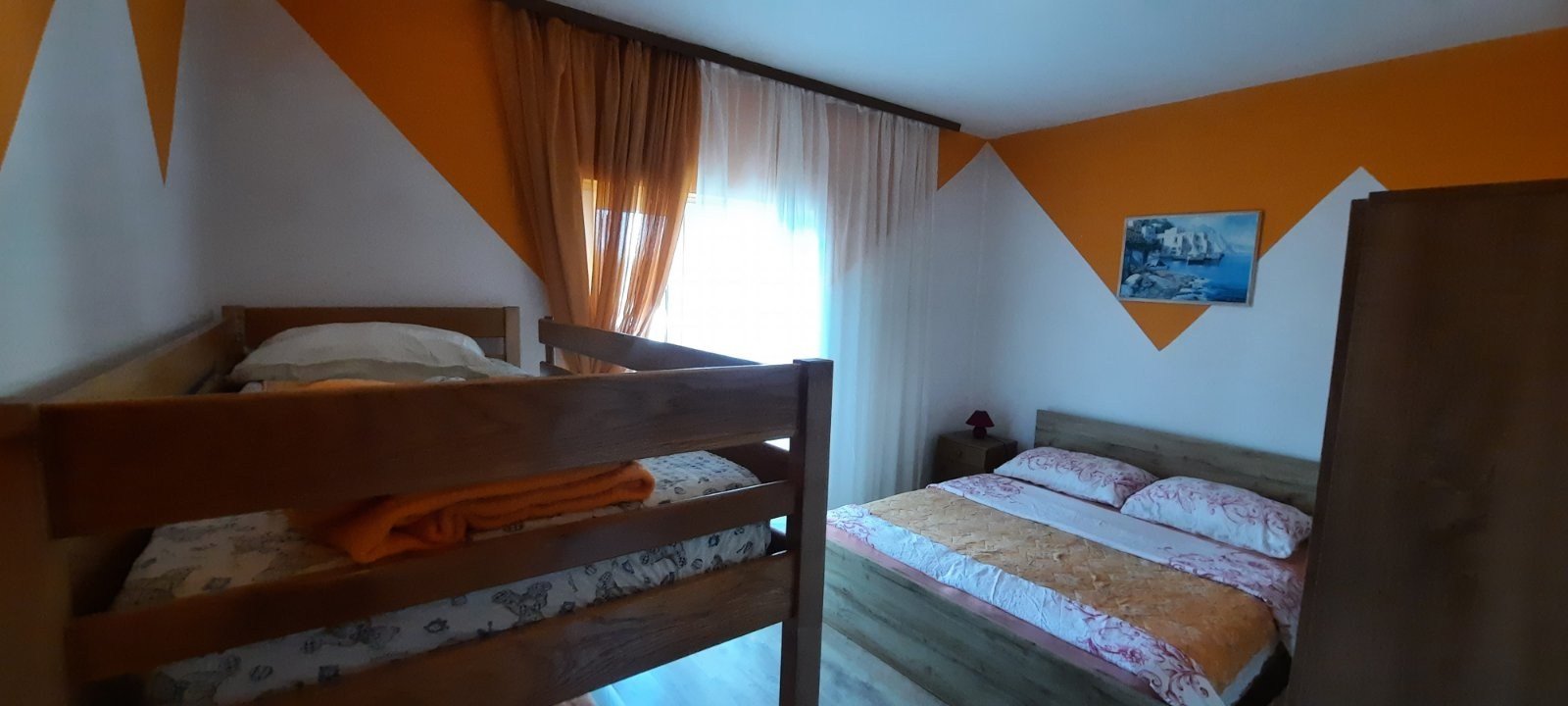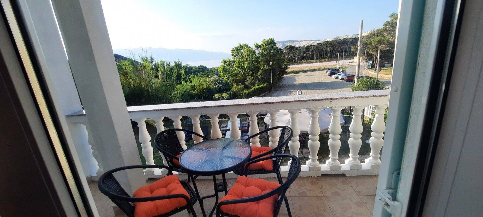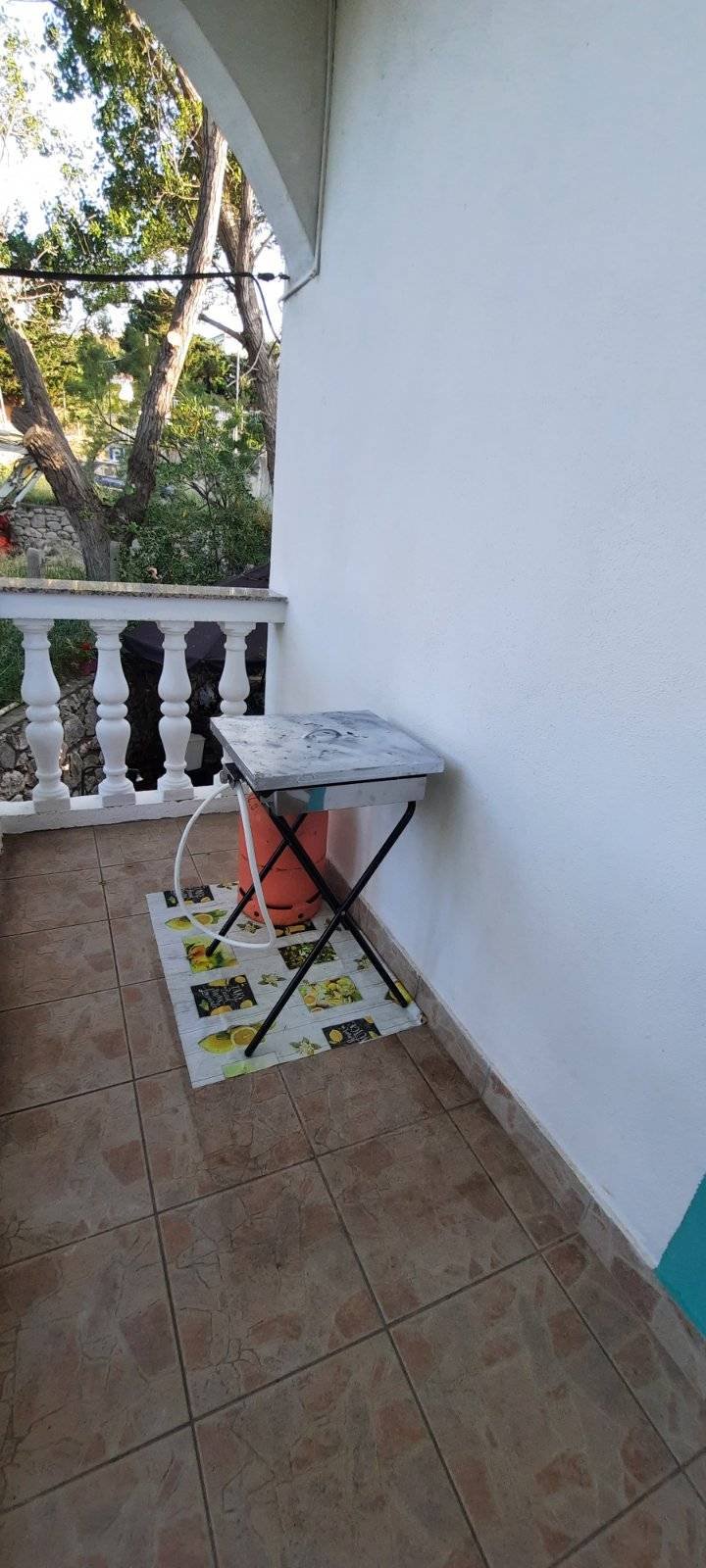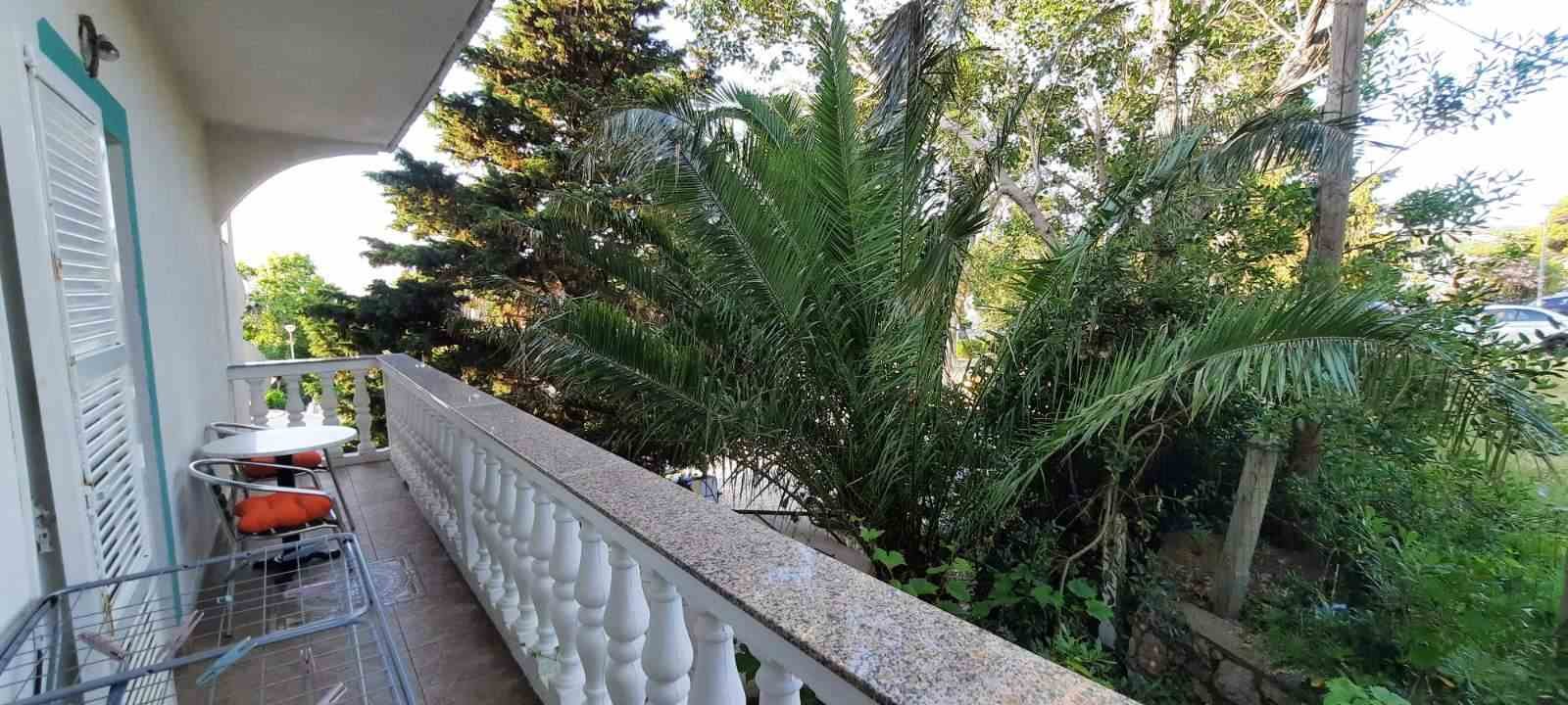 -2 spavaće sobe (veća soba sa bračnim krevetom i krevetom na kat za do 4 osobe, manja soba je sa bračnim krevetom za 2 osobe) , veća soba ima balkon sa pogledom na more a manja na parking i drveće